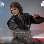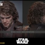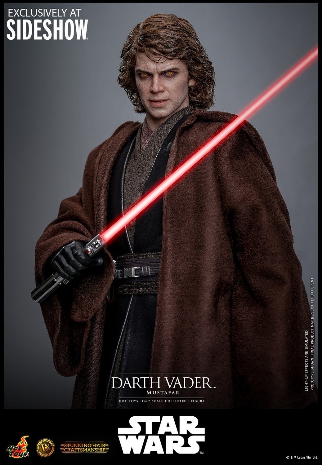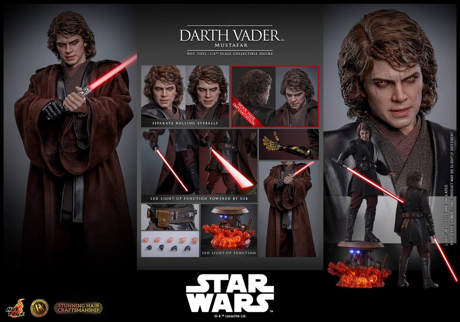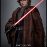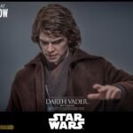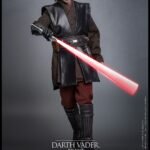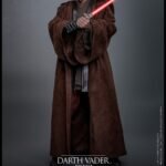 The sixth-scale figure features a head sculpt with separate rolling eyeballs and meticulously implanted mid-length curly dark brown hair made of wool material to enhance realism. His face shows Sith-yellow iris eyes, detailed scars, and a tortured expression that echoes his transformation. Further enhancing the figure is a mechno right arm, symbolic of his shifting identity, along with nine interchangeable hands ranging from fists to lightsaber-holding and Force-using gestures. His multi-layered costume is finely tailored, including a bendable wire-embedded Jedi robe, a leather-like tabard, tunics, pants, and long boots, combined with a utility belt with pouches and a lightsaber hilt holder.
