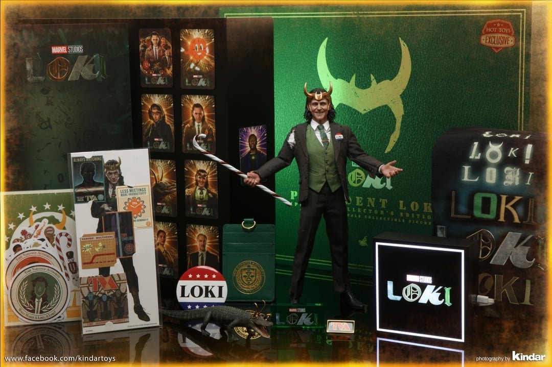Masterfully crafted based on the screen appearance of Tom Hiddleston as President Loki in the series, the figure features a newly developed head sculpt and his horned helmet with delicate craftsmanship, election campaign pin on the suit applied with weathering effects perfectly translating the details; a pair of daggers, greatly detailed accessories such as Alligator Loki in one-sixth scale, a cane, a specially designed character backdrop with lenticular effect, and a themed figure stand.