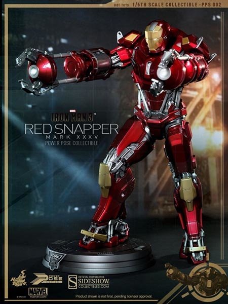 Marvel Studios’ IRON MAN 3 is hitting the theaters this week! The newest trailers have introduced a multitude of new suits. Today, we’re excited to present one of the brand new armors from Hot Toys’ Power Pose Series (PPS), the Red Snapper Sixth Scale Collectible Figure. The Mark XXXV (35) disaster rescue suit includes an extendable arm and movable claw-like hands which can perform film-accurate poses. The Red Snapper Mark XXXV (35) features LED light-up functions and a figure display stand with a Red Snapper and Stark Industries nameplate.