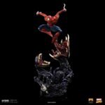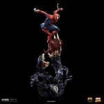 Flexing his mighty muscles, the legendary friendly neighborhood superhero uses the maximum of his arachnid strength and dexterity to dodge and stay away from the attack of one of his most terrifying and powerful enemies, Venom. With the viscous tar alien biomass that form his rival leaking underneath his feet, with tentacles and tendrils taking the shape of two trunks with mouths, fangs and long tongues trying to capture him like two carnivorous plants searching for their prey, the fearless wall climber superhero leans resolute on his webs facing the powerful and lethal creature.