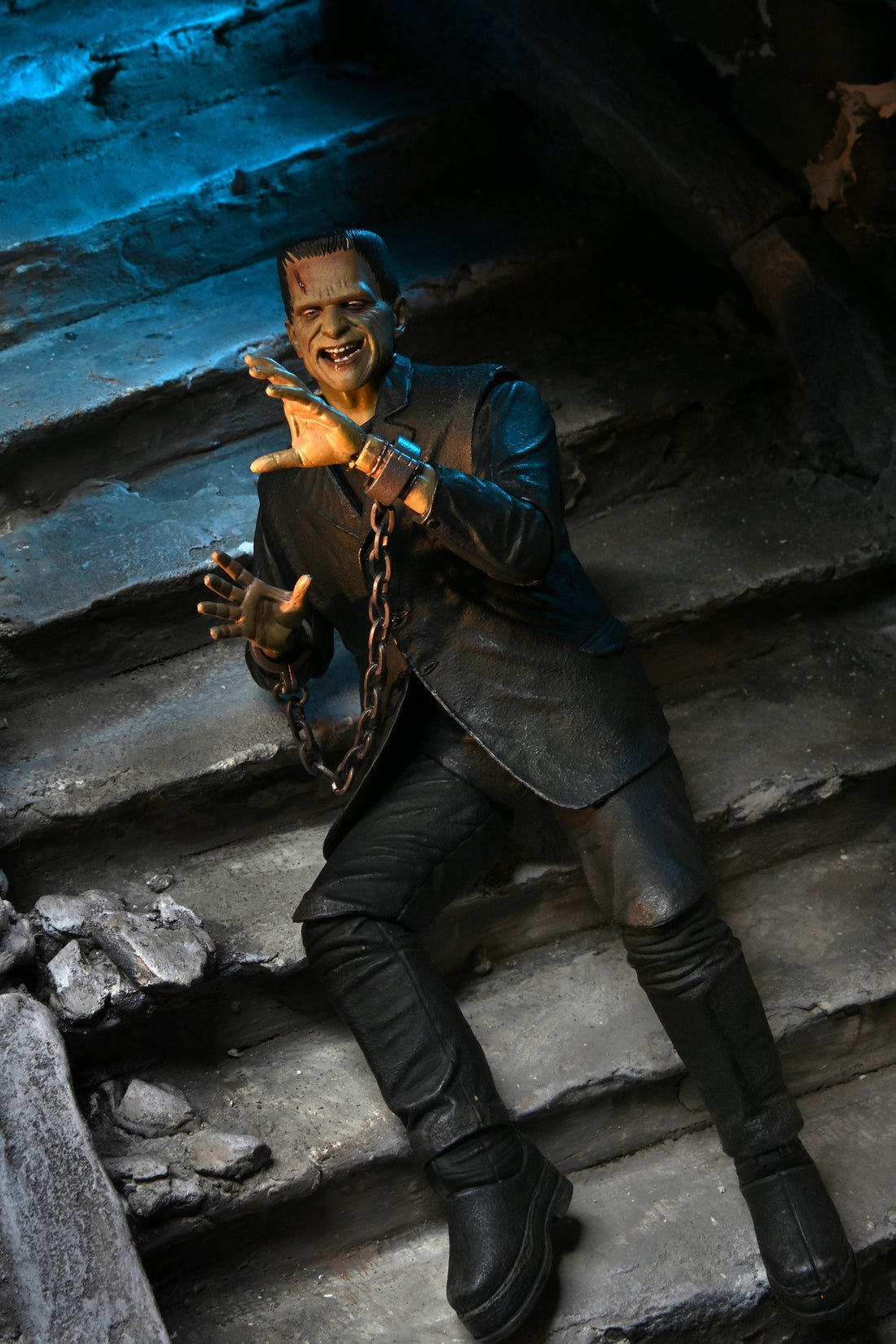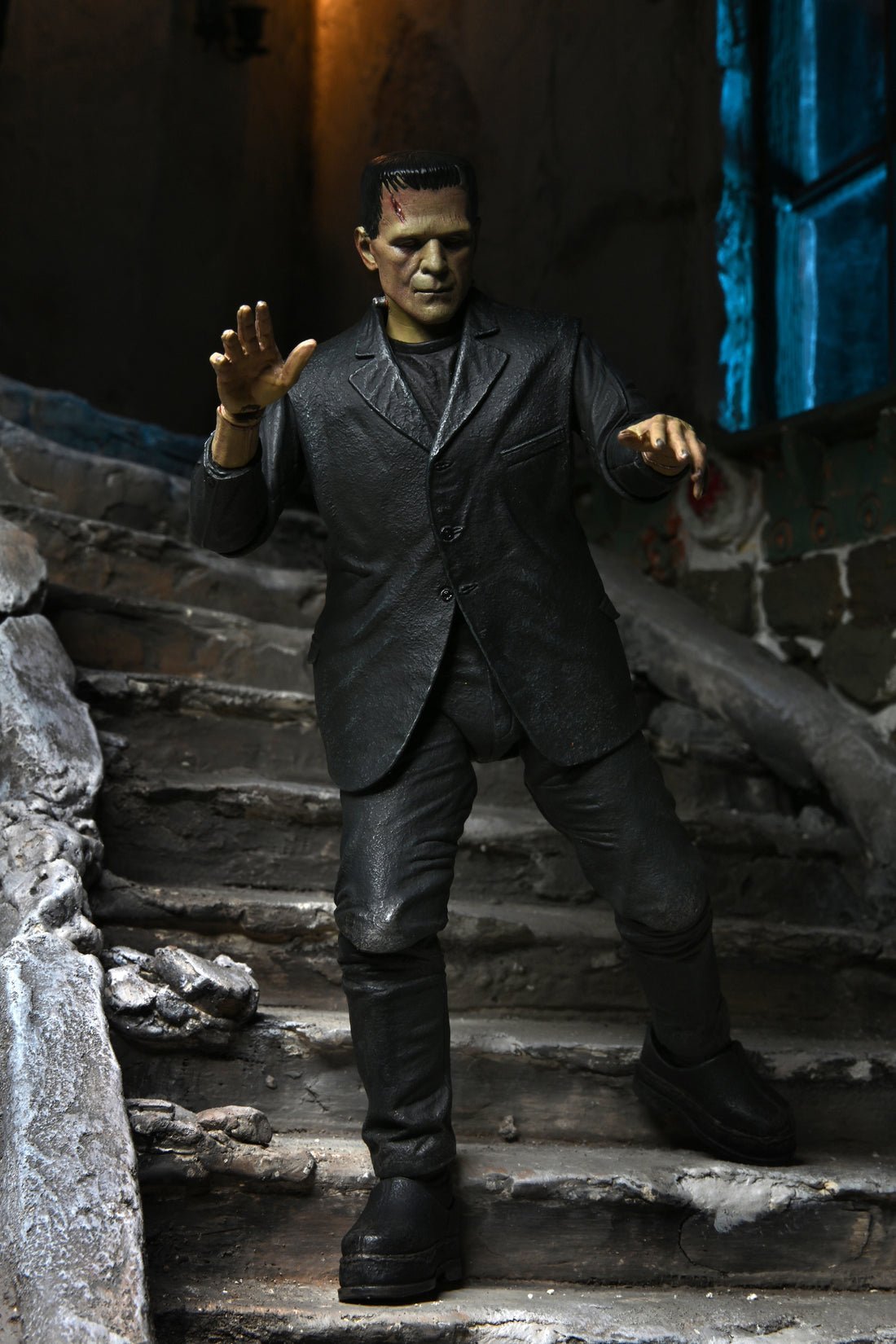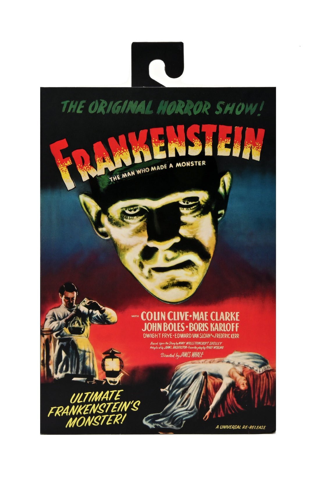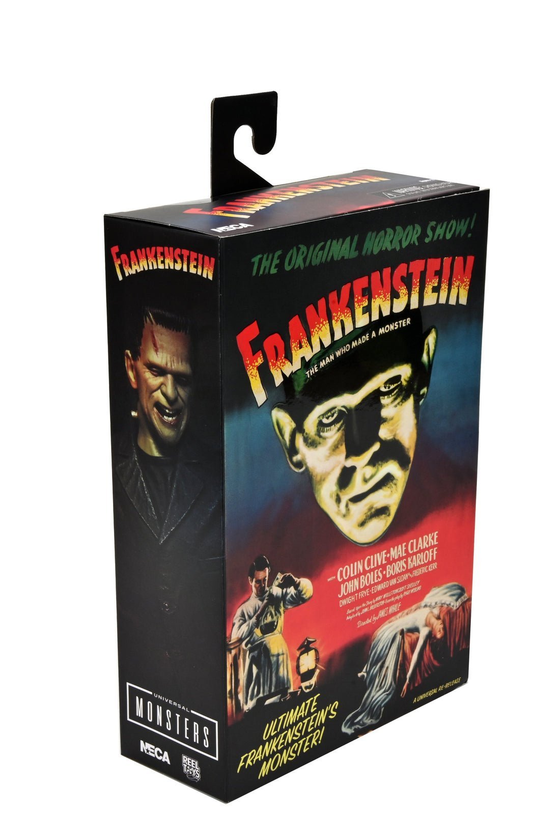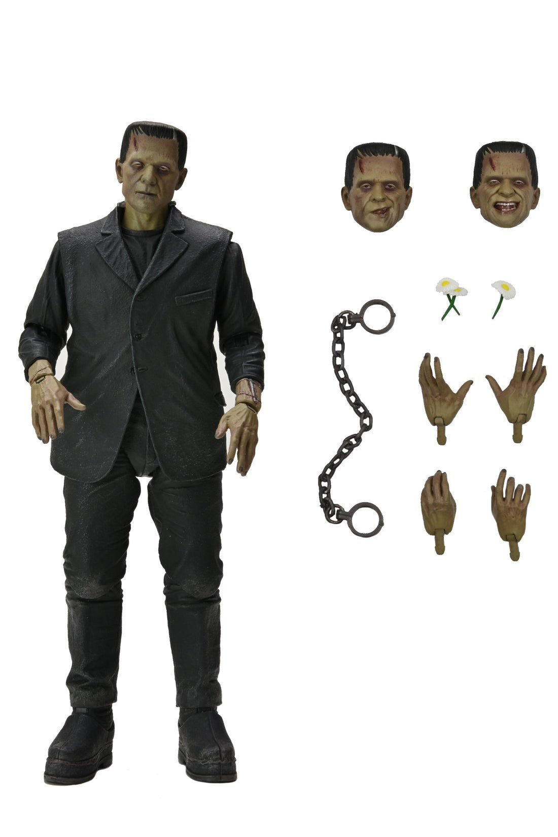 To celebrate the 90th anniversary of the acclaimed silver-screen classic Frankenstein, NECA announces the triumphant debut of Universal Monsters in its Ultimate action figure line! The sculpt captures Boris Karloff’s poignant portrayal of the misunderstood monster in color. Standing in 7” scale, the figure comes in premium anniversary packaging with plenty of accessories: 3 interchangeable heads, 6 interchangeable hands, shackles and daisies..