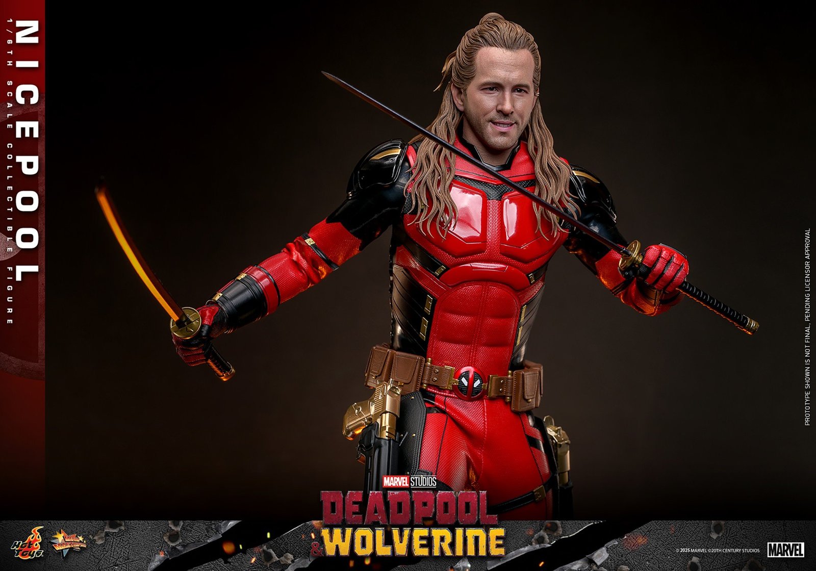 Meticulously crafted based on the appearance of Ryan Reynolds as Nicepool in the movie, the figure features a newly developed head sculpt with impressive likeness and separate rolling eyeballs, detailed hair sculpture, and a beautifully tailored glossy Nicepool suit in the signature red and black color scheme. Weapons and accessories includes his special metallic gold-colored pistols to match his ear huggie, a dagger, a pair of katanas with a magnetic sheath attachable to the back, and his Dogpool wearing goggles. It also comes with a specially designed LED lighted figure base to give Nicepool’s beautiful look the spotlight it deserves.