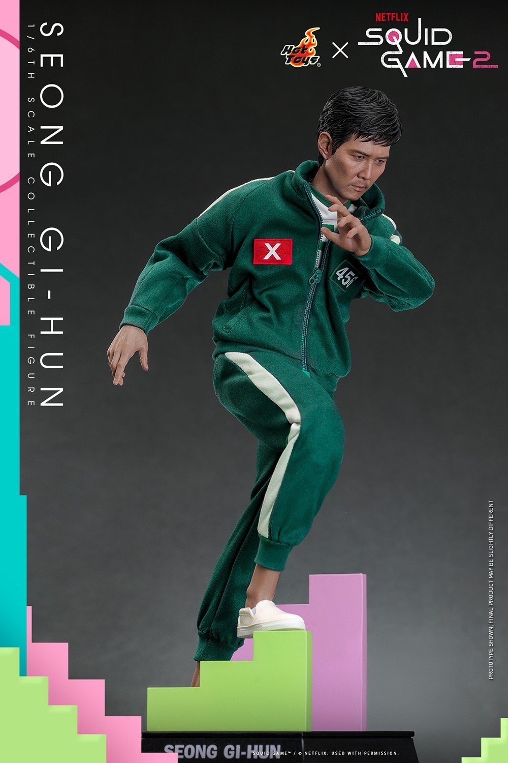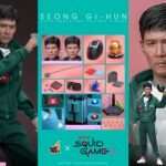 The highly accurate sixth-scale action figure is masterfully crafted based on the appearance of Lee Jung-jae as Seong Gi-hun in Squid Game, featuring a newly developed head sculpt with separate rolling eyeballs, and a newly designed body that is pulled together with a faithfully tailored Squid Game tracksuit with No. 456 embroidery and cross sign badge details. In addition to Seong Gi-hun, a series of accessories appears in the Squid Game is included: a USB-powered voting machine, a Piggybank, a mask accessory with square symbol, a six-legged pentathlon game set consisting of a pair of ankle cuffs, a pair of Ddakji, a pair of Biseokchigi, a set of Gonggi stones, a shuttlecock, a spinning top, and a special figure base designed to replicate the staircase setting.