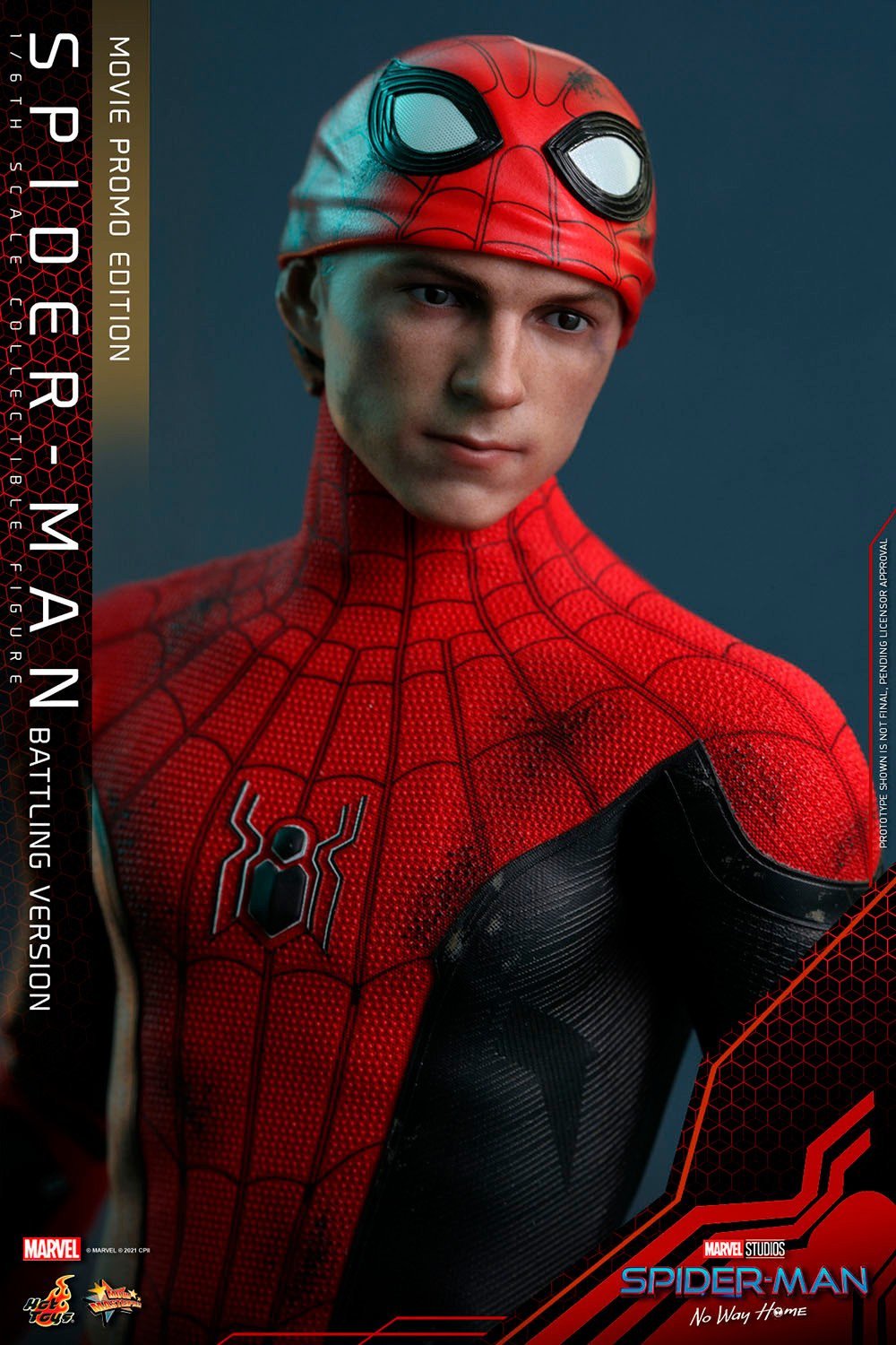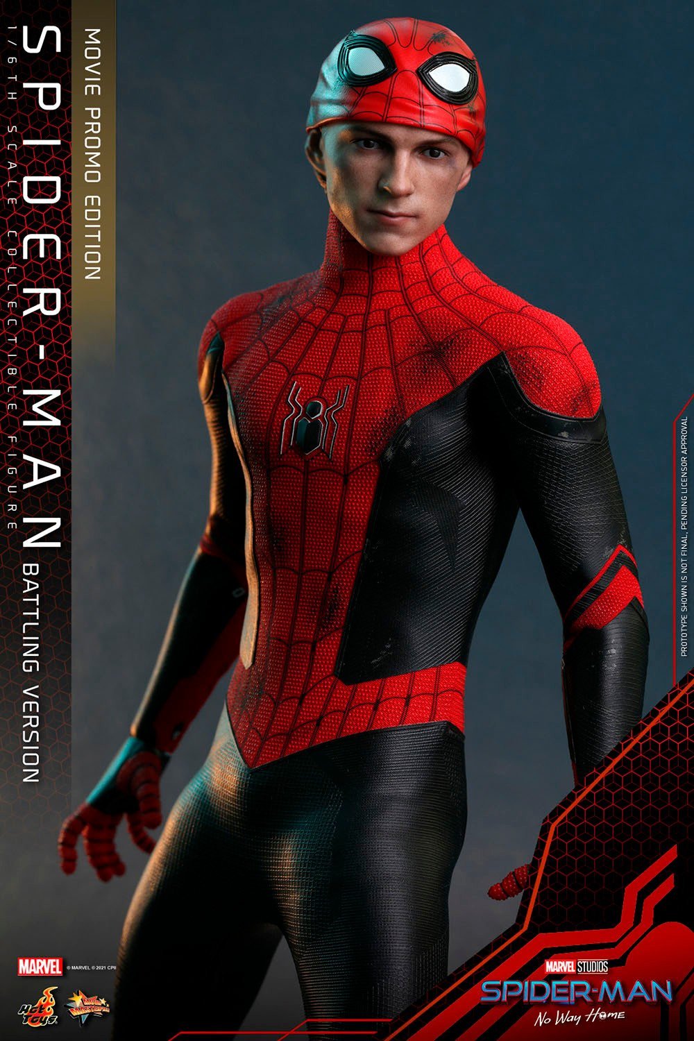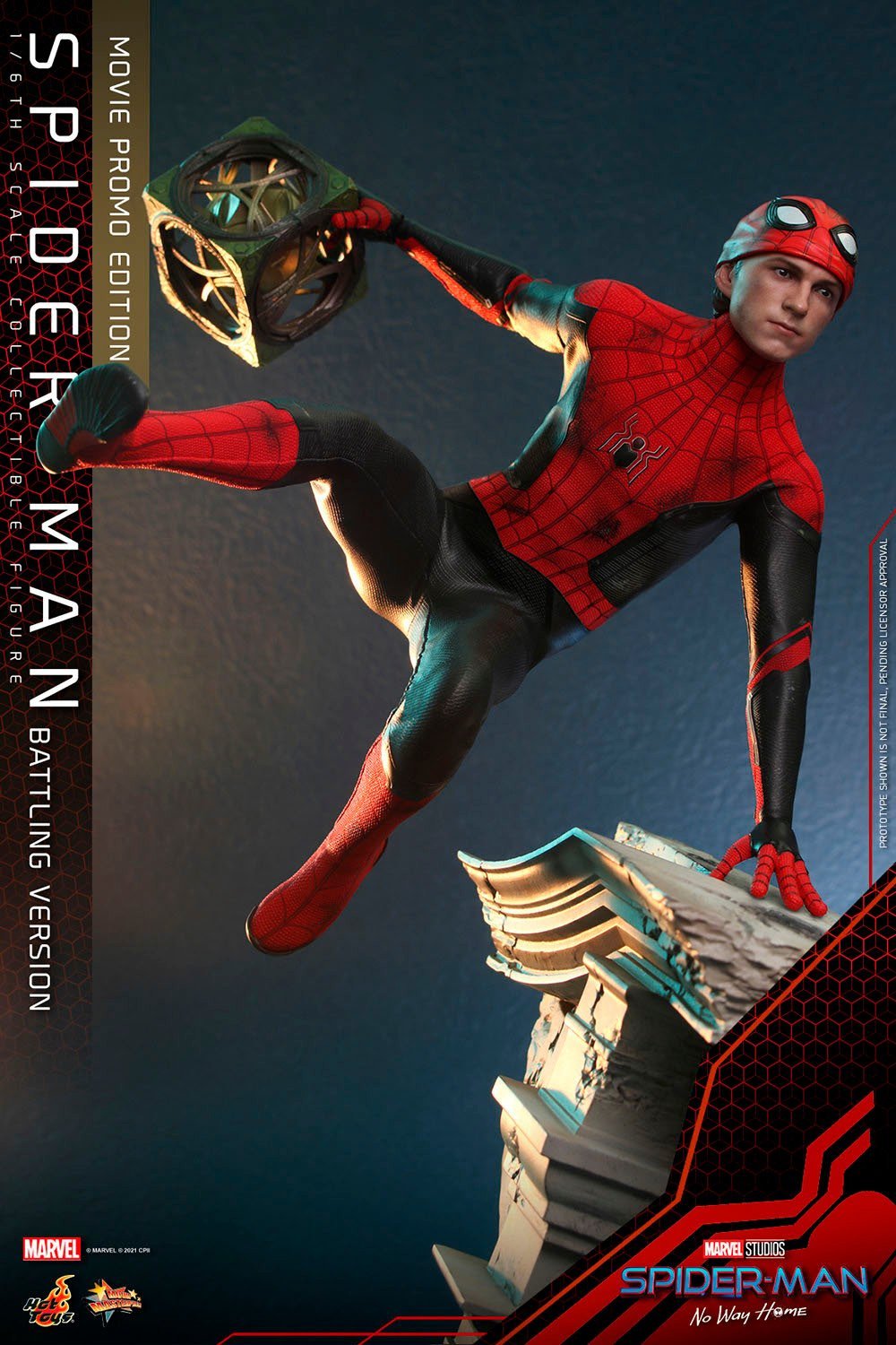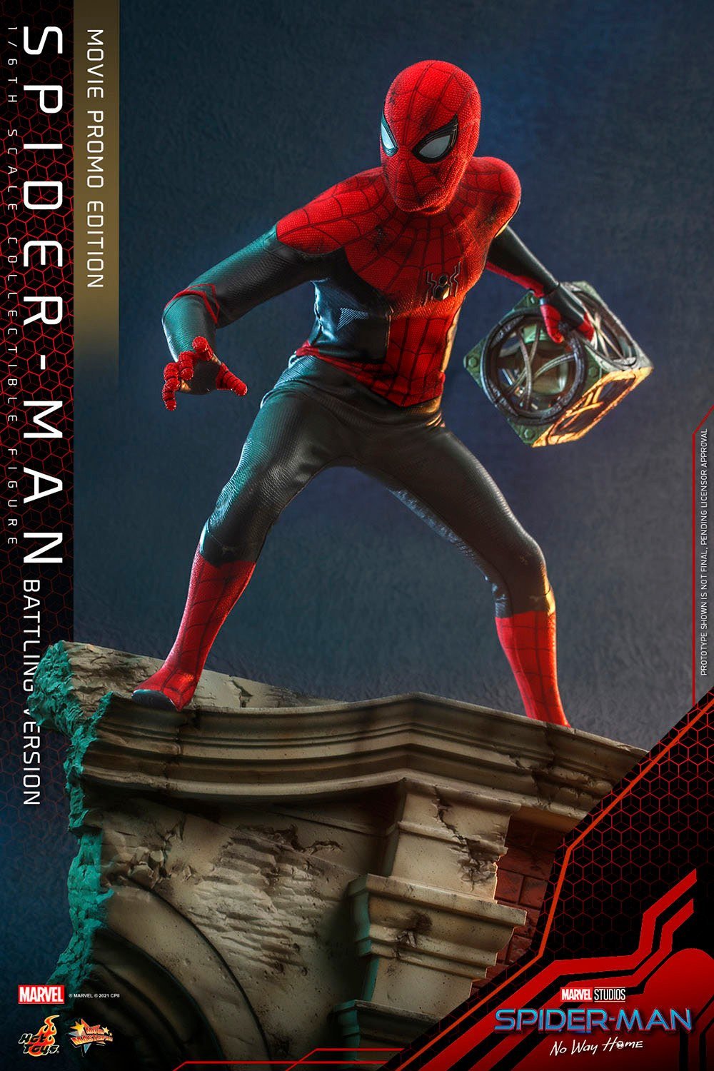 Inspired by the Spider-Man: No Way Home movie, Sideshow and Hot Toys present the Spider-Man (Battling Version) Movie Promo Edition Sixth Scale Collectible Figure with impressive battle damaged and weathering paint applications, that depicts the young wall-crawler holding The Box taken from Doctor Strange as seen in the film. This amazing Marvel collectible figure will be available in selected markets only!